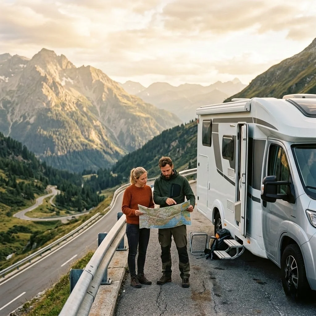Een stel staat naast hun camper langs een bergweg en bekijkt samen een routekaart. Op de achtergrond zijn slingerende wegen en hoge bergen zichtbaar in warm avondlicht. De foto illustreert de groeiende populariteit van internationale camperreizen waarbij voorbereiding en zekerheid een belangrijke rol spelen.